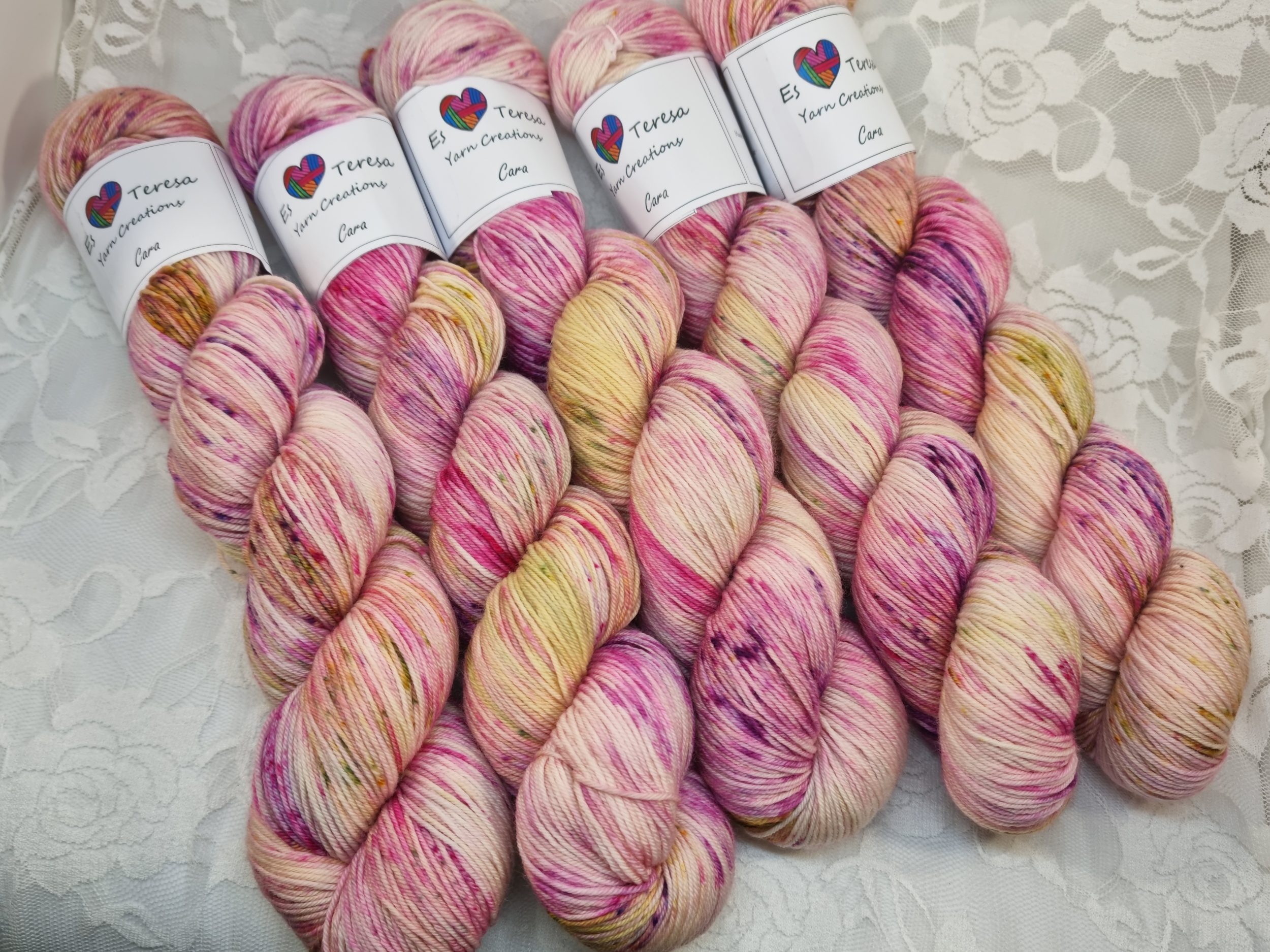 Each 100g skein of 4 ply sock/fingering weight yarn is about 400m.