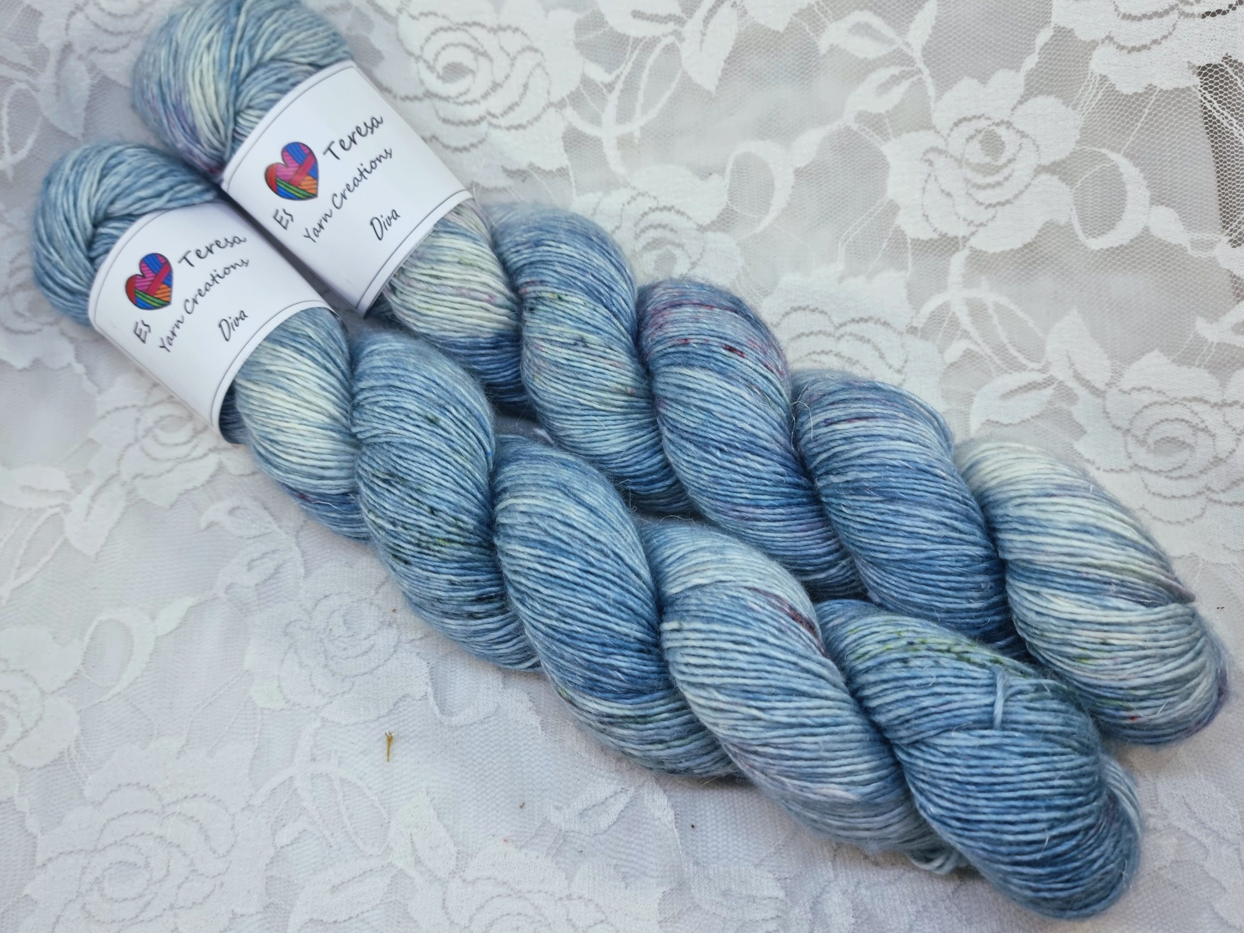 Each 100g skein of single ply sock/fingering weight yarn is about 350m.