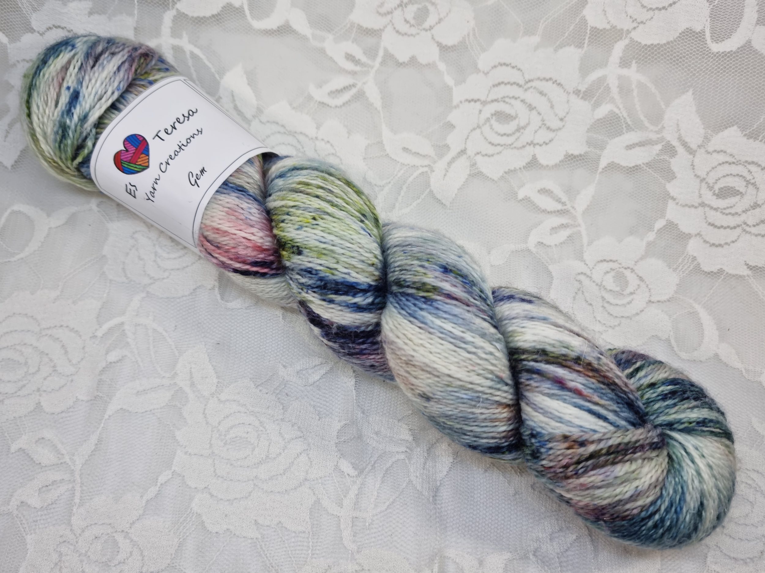 Each 100g skein of 2 ply sock/fingering weight yarn is about 375m.