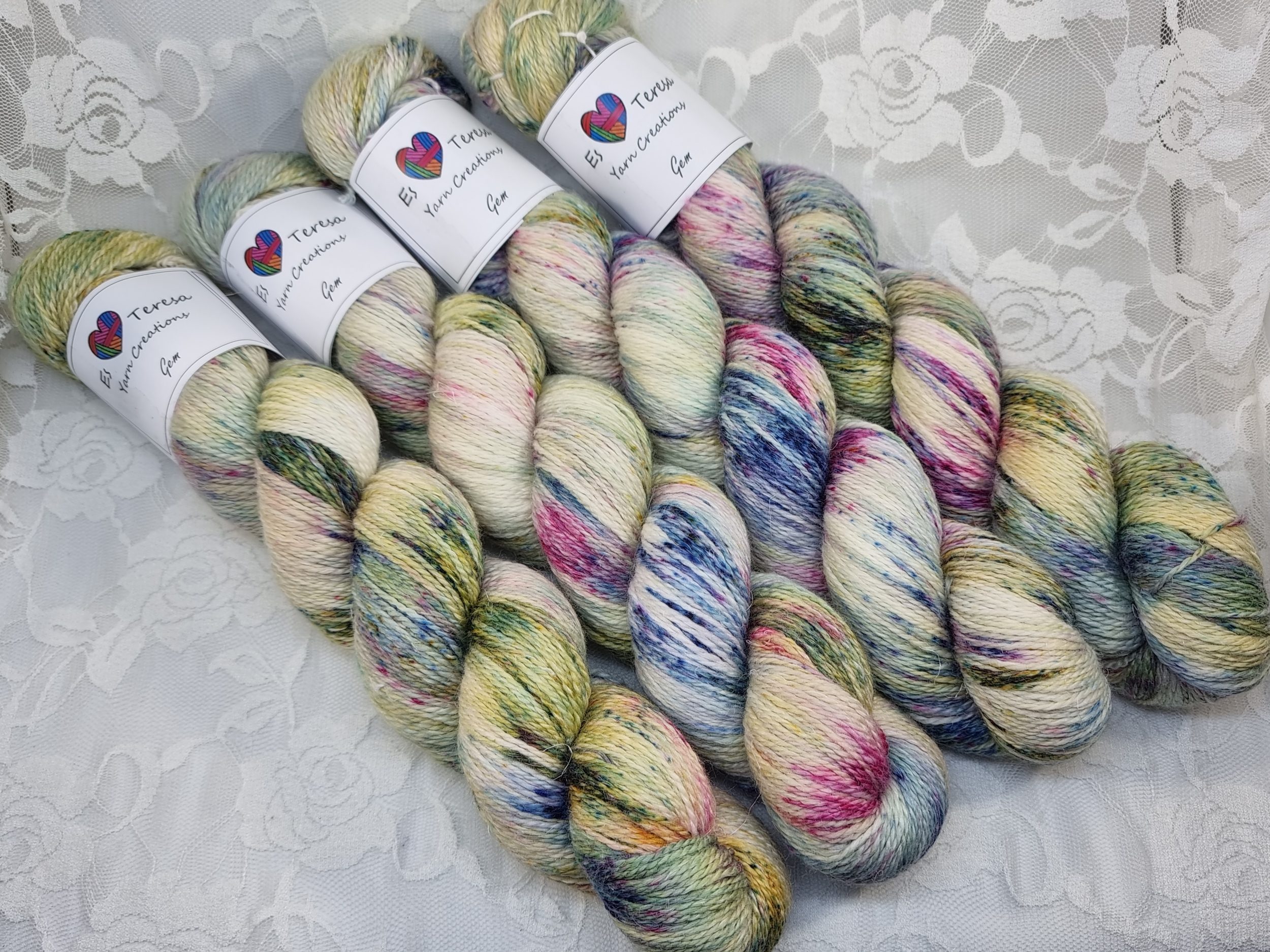 Each 100g skein of 2 ply sock/fingering weight yarn is about 375m.