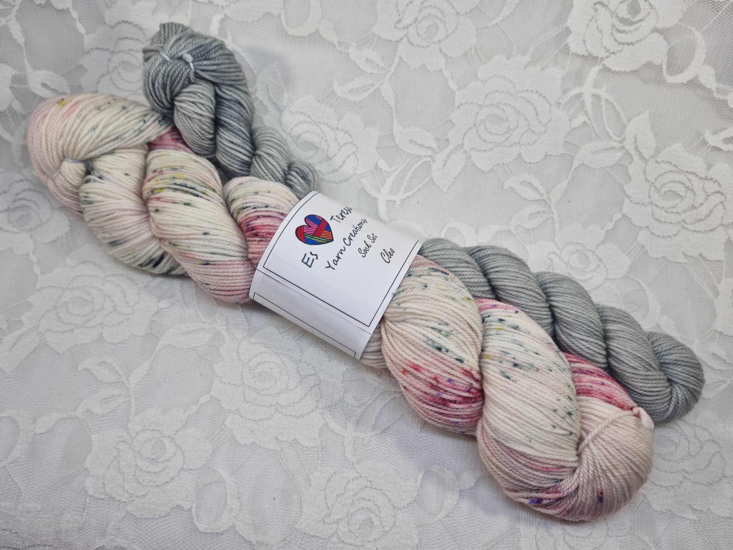This sock set contains 1 x 80g skein and 1 x 30g skein (in a contrasting colour for heels, cuffs and toes) = 110g in total.