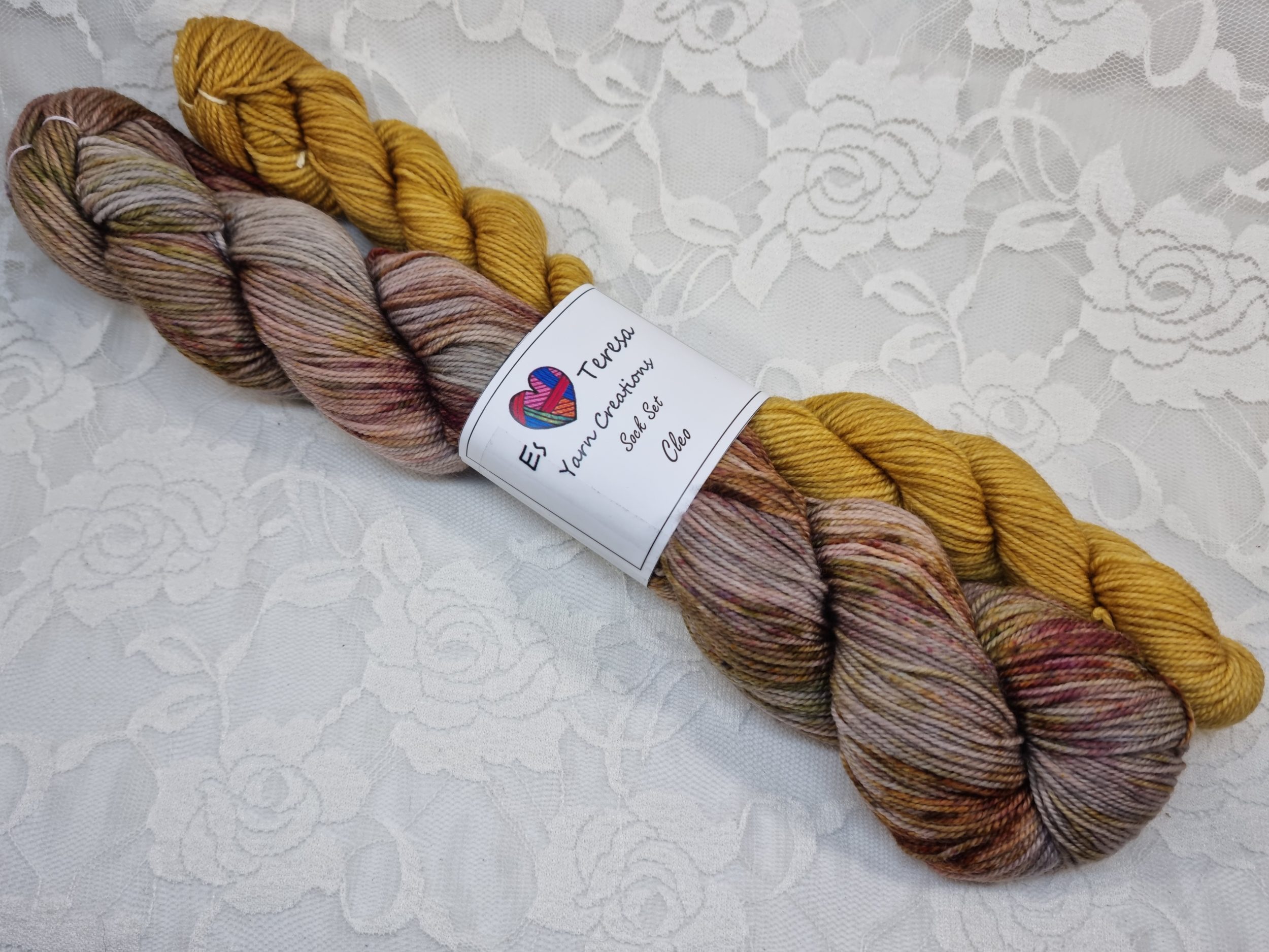 This sock set contains 1 x 80g skein and 1 x 30g skein (in a contrasting colour for heels, cuffs and toes) = 110g in total.
