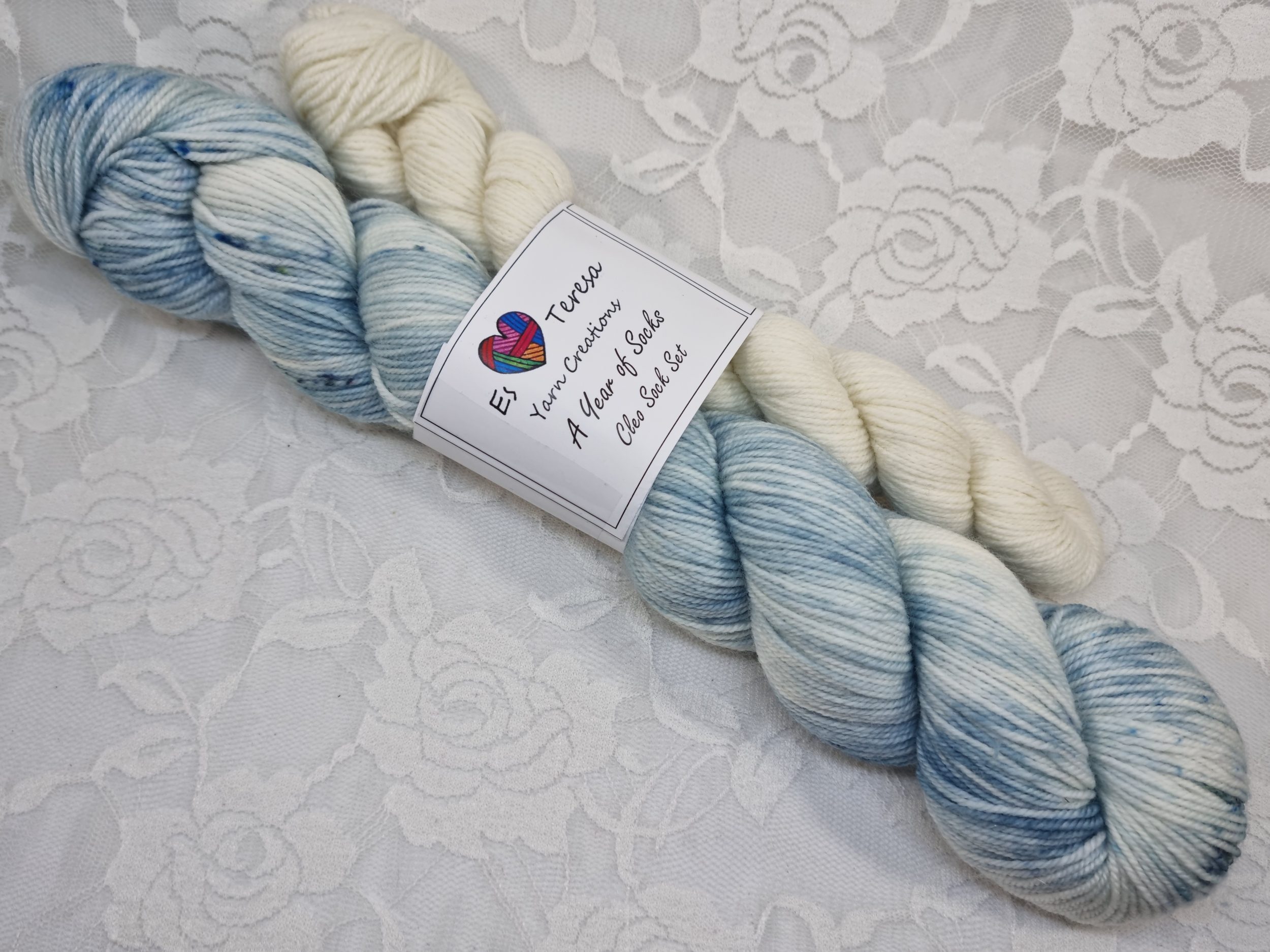 This sock set contains 1 x 80g skein and 1 x 30g skein (in a contrasting colour for heels, cuffs and toes) = 110g in total.