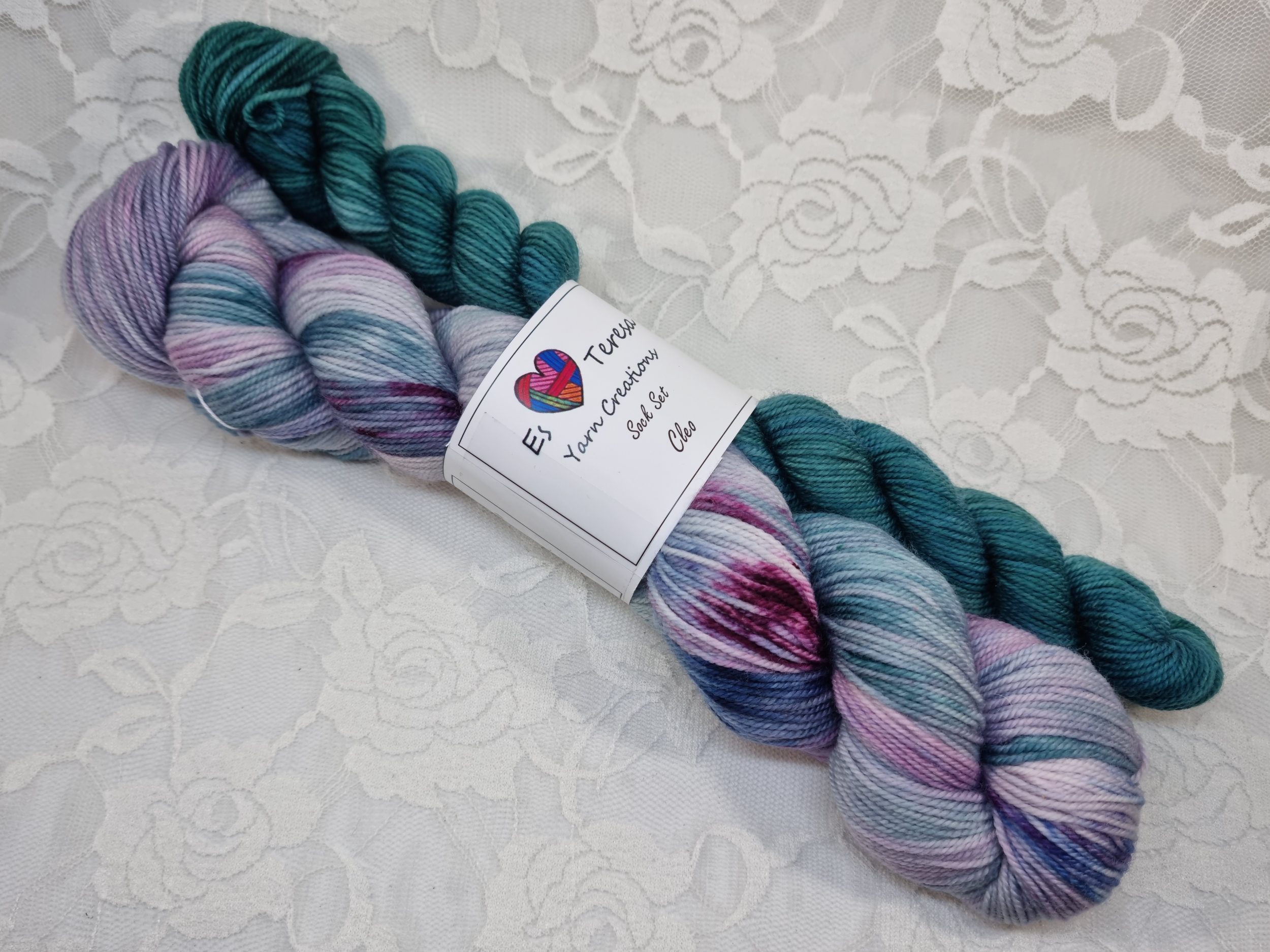 This sock set contains 1 x 80g skein and 1 x 30g skein (in a contrasting colour for heels, cuffs and toes) = 110g in total.