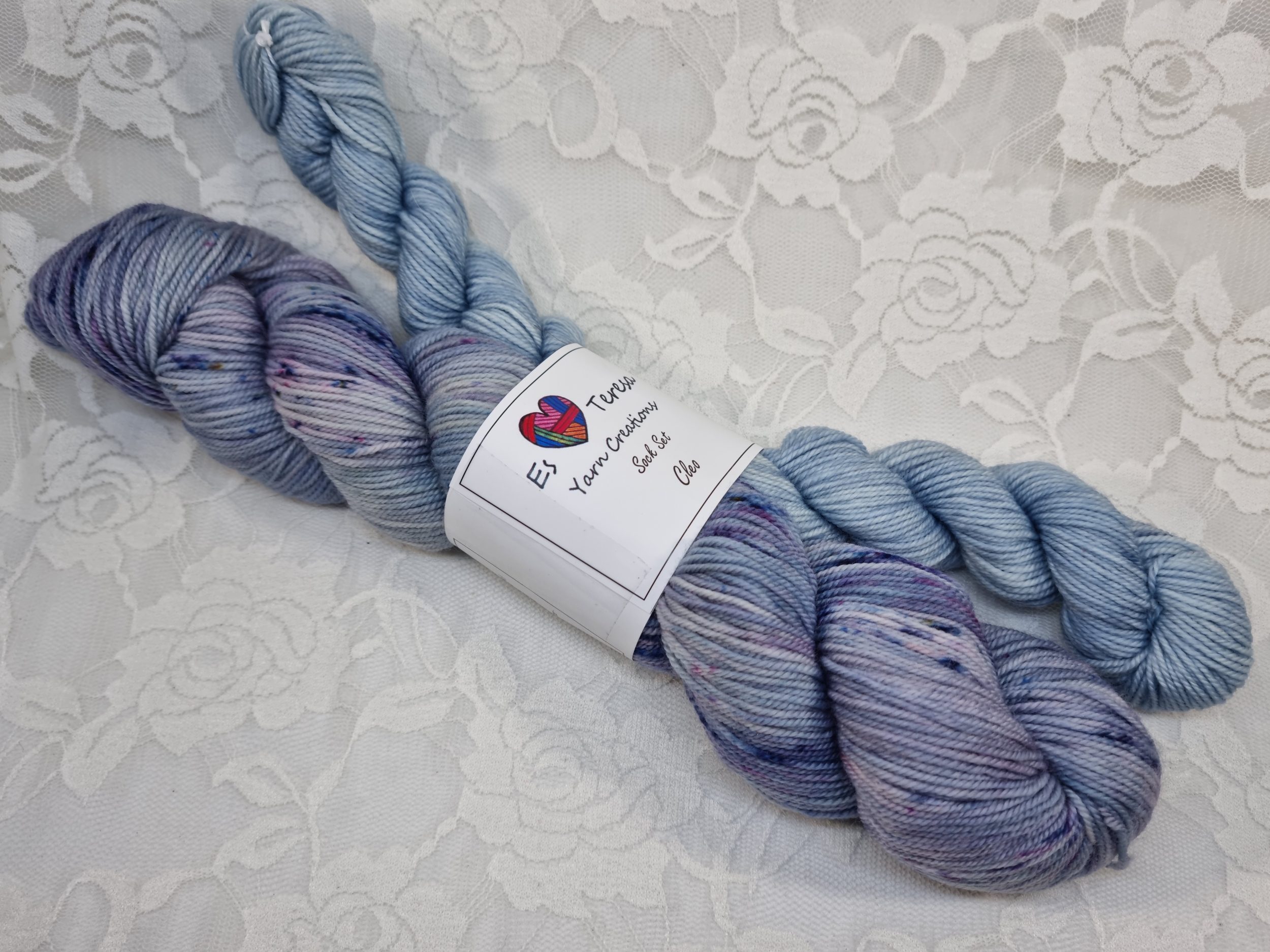 This sock set contains 1 x 80g skein and 1 x 30g skein (in a contrasting colour for heels, cuffs and toes) = 110g in total.